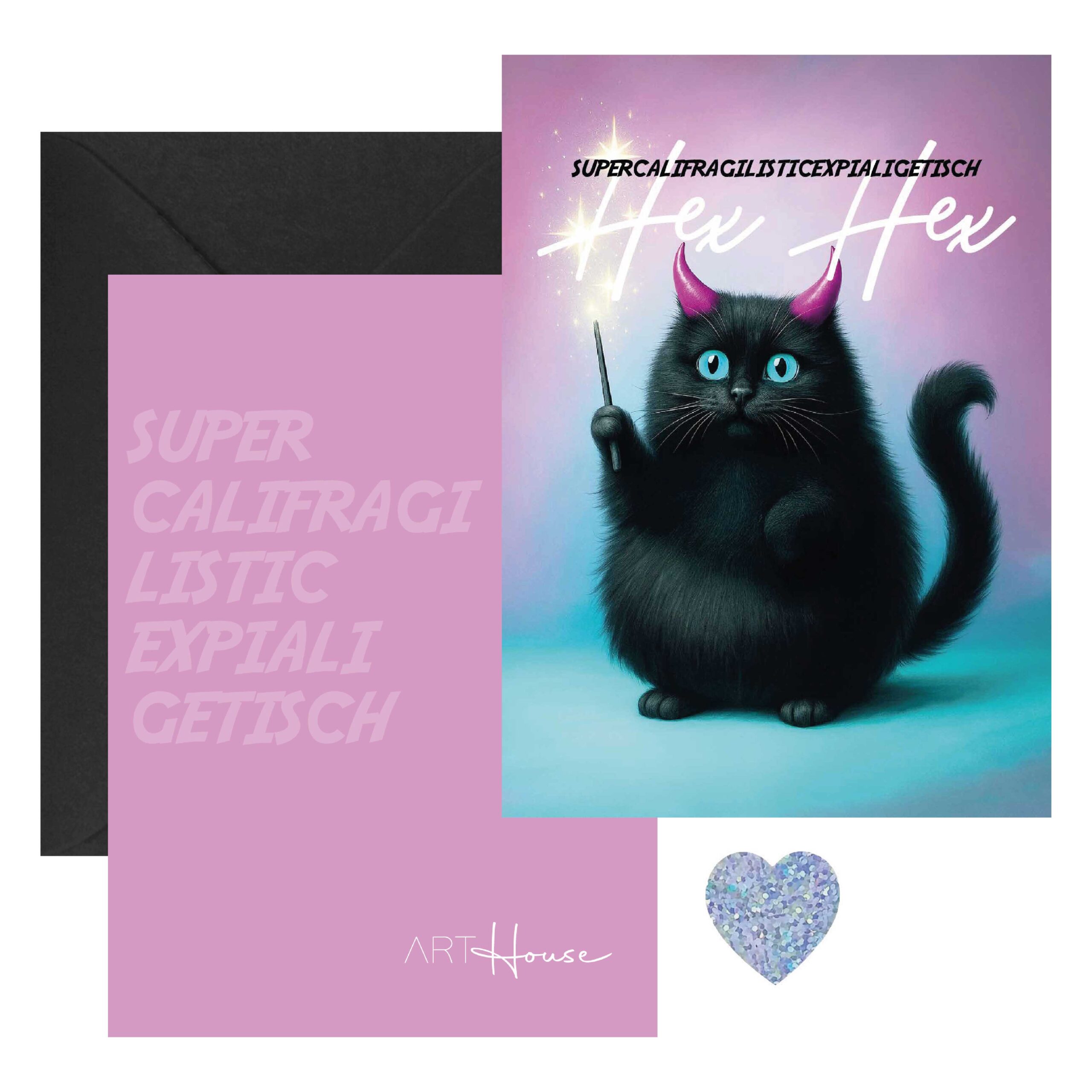 Diese liebevoll gestaltete Designer-Postkarte zeigt eine niedliche schwarze Zauberkatze mit leuchtenden Augen, pinken Hörnchen und funkelndem Zauberstab – kombiniert mit dem verspielten Schriftzug „Supercalifragilisticexpialigetisch – Hex Hex“ für echte Magic-Vibes.